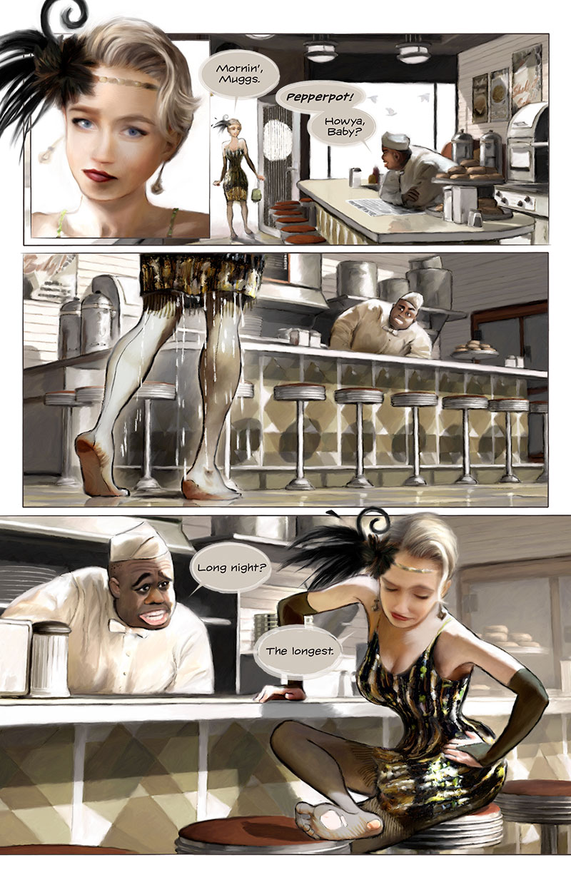 I enjoy painting sunlight draped on just about anything that sunlight can drape itself on. Panel three's Pepperpot, with morning light wrapped ‘round her back, was a particularly enjoyable session, not to mention the fun of putting the bounce light reflecting from Muggsy’s white shirt onto her face.