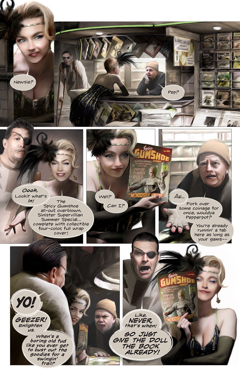 Out of all the umpteen square yards of ever so slightly misaligned dot screen papering Newsie’s newsstand Pepperpot plucks her most prized repository of taste and restraint, the Spicy Gumshoe all-out, overblown, Chinatown Tong War Summer Special, the first and last pulp magazine cover illustration I’ll ever do.