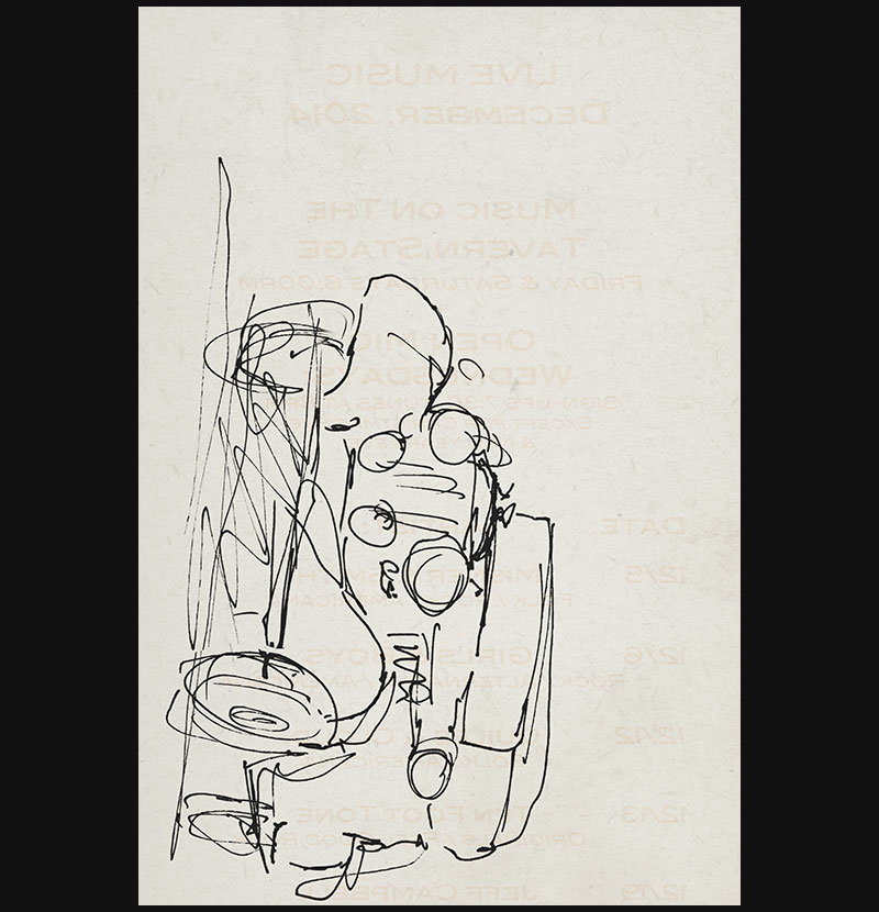 Below, at actual size, is the fateful initial Sharpie scribble of the Rolls scrawled on the back of a local watering hole’s Dec. 2014 live music flyer. |
