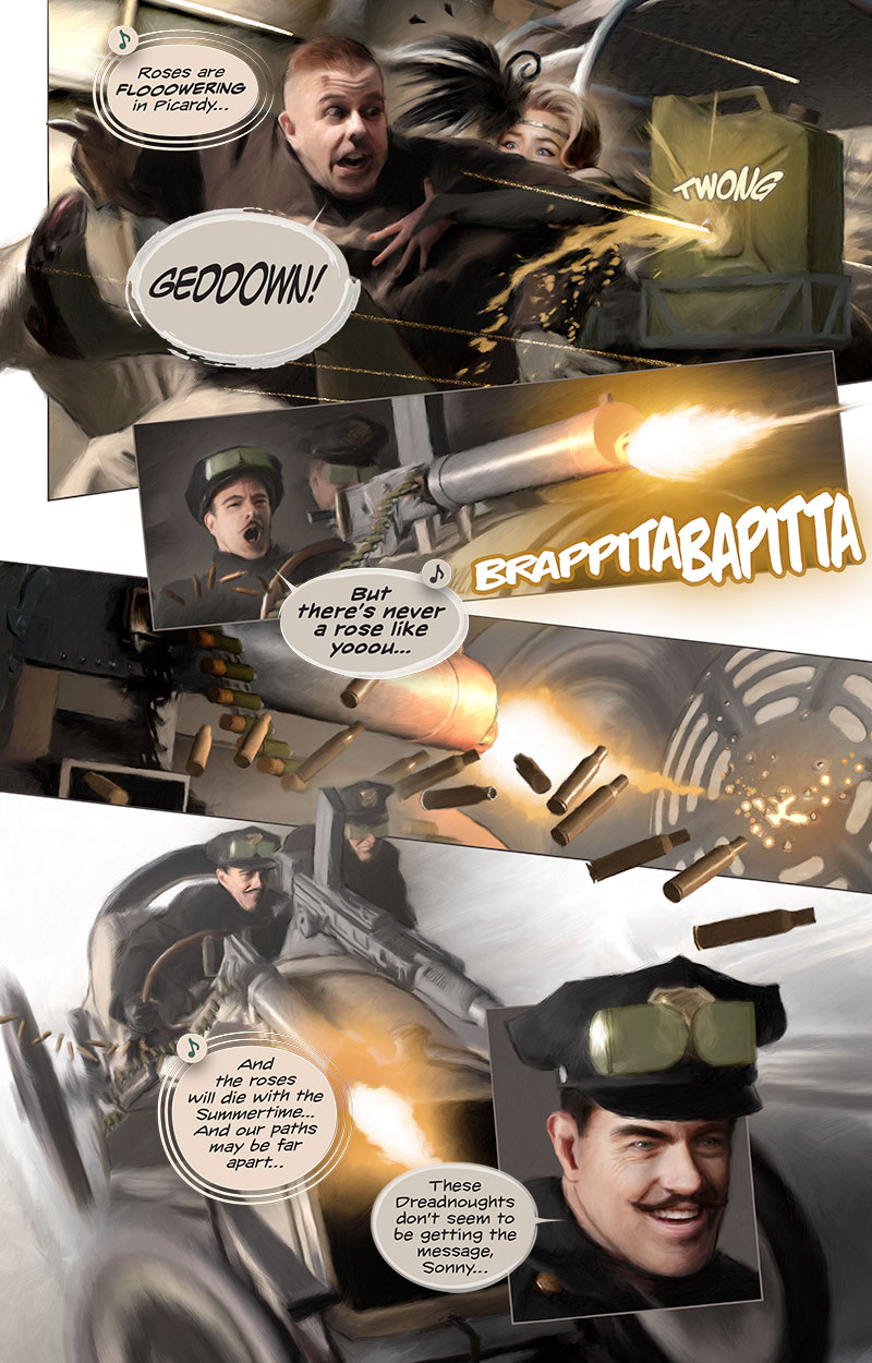 06/15/2015I like how the Gunboat, the cannon and Vickers gun, all of it down there in panel four - even the wheels of the thing - do a kind of not particularly subtle Gumby bend into the skidding turn. That was big, big fun to do.Jos. |