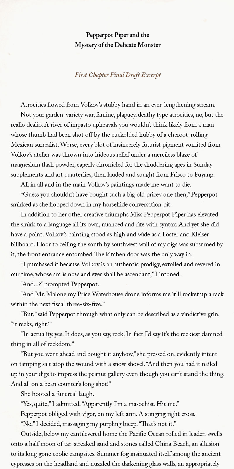 A while ago I thought wouldn’t it be a blast and a half to write a Pepperpot Piper murder mystery novel… one that starts like a week before and then leads up to the first panel of the comic strip… one with a whole lineup of creepy pulp suspects… and most importantly, one that I could whang up on Amazon?