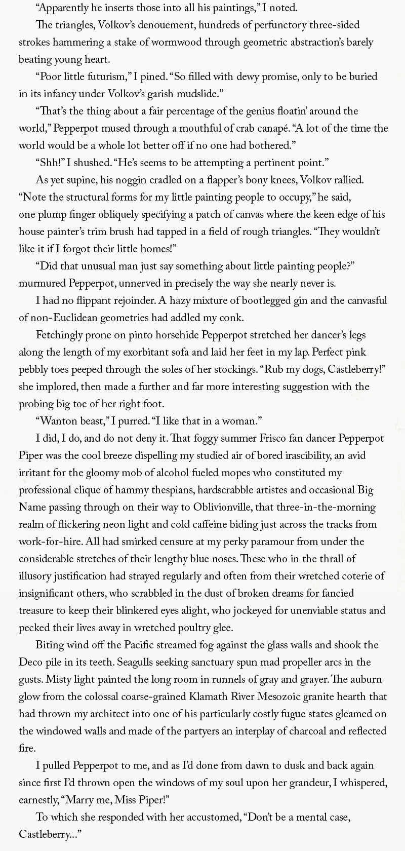 So now, to put the spurs to my dormant guilt here are the first 1500 words laid out in exquisite Garamond.