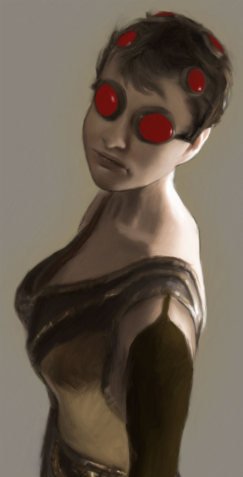 10/02/2017Stay glued to your seats, fellow travelers...Because here’s a test for an incoming character (page 121-ish) whose headdress gives her a spider’s 180° arc of visual field. Now, why ever would she need that? |