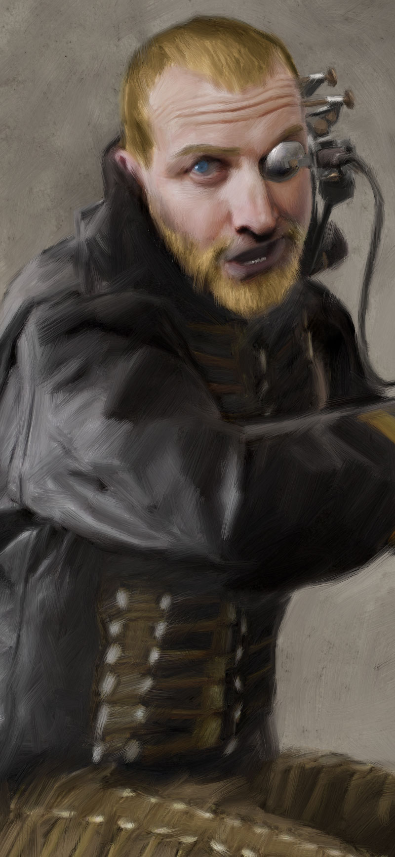 The sniper and his proto-cybernetic gun sight, close-up: