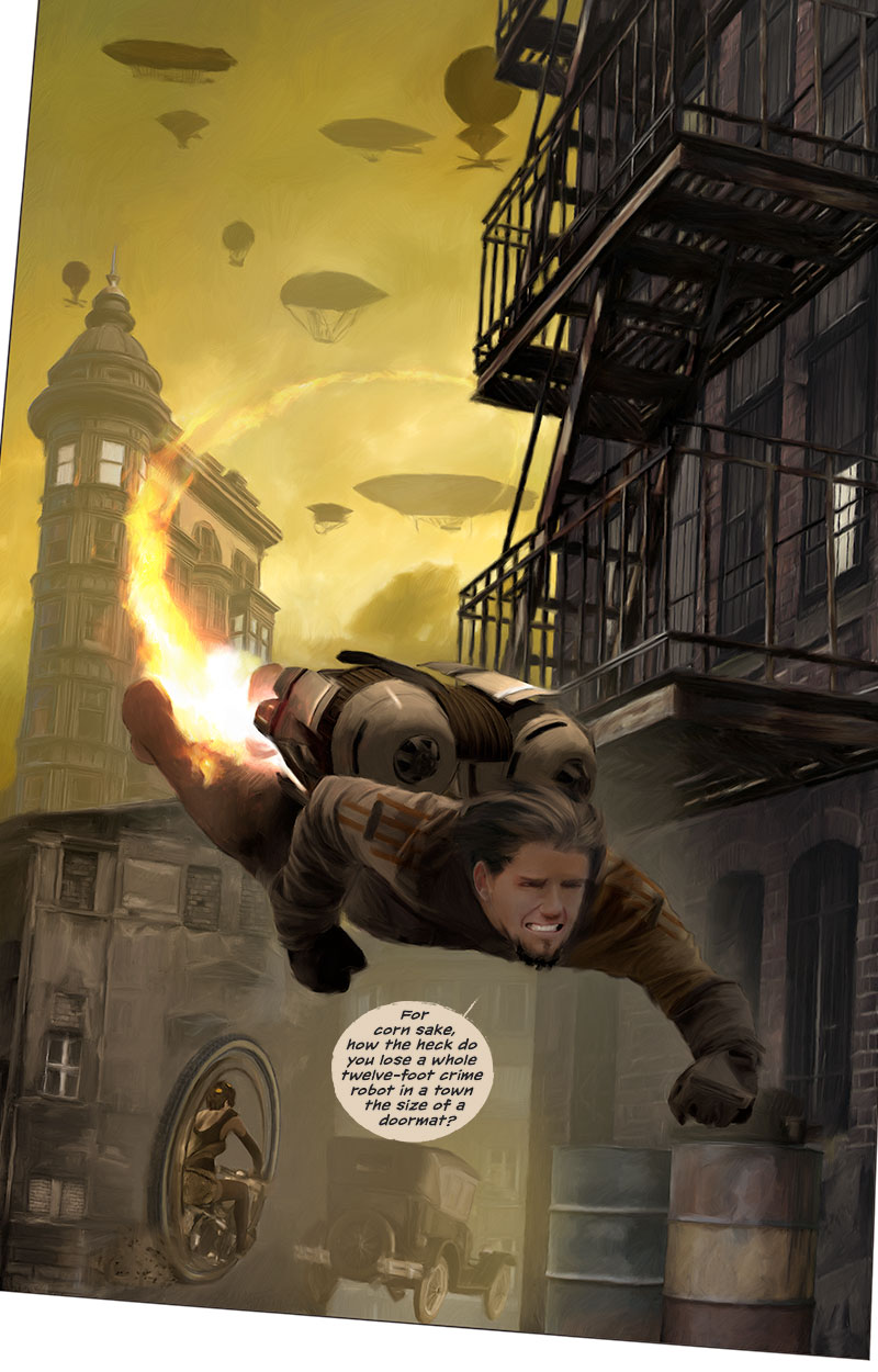 So far this is the only page of Pepperpot Piper that’s just one panel. It started out as three but I really wanted to show that fire escape. Sounds strange but I’ve wanted to take a crack at painting an old iron fire escape for years and years... so many repetitive angles, overlapping layers and textures. Add the bricks behind it and it’s a full throttle artistic migraine. There’s nothing else like it.