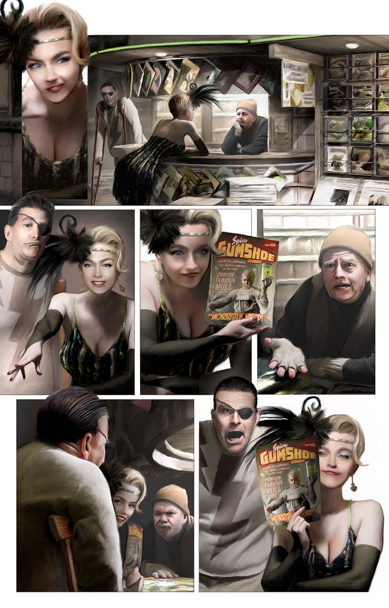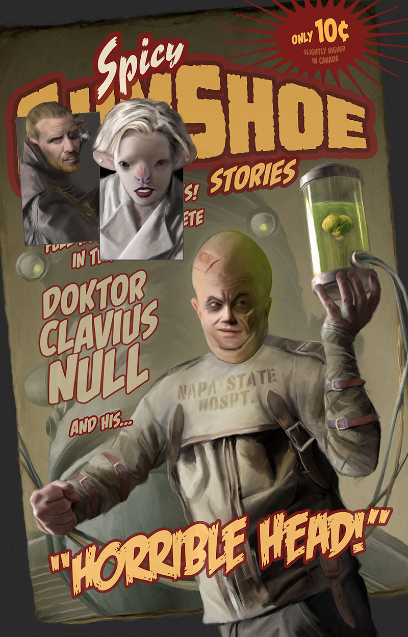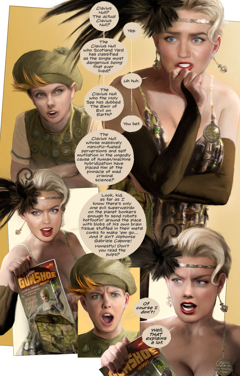 04/27/2020I realized that the Spicy Gumshoe Stories pulp rag that Pepperpot's been carrying in her purse since page 34, originally just a generic Chinatown Tong war image, would be a great way to foreshadow Pep's eventual run-in with Clavius Null, so I went back and changed the mag's cover on pages 34 and 134.When you're a lunatic you can do that sort of thing and nobody bats an eye.