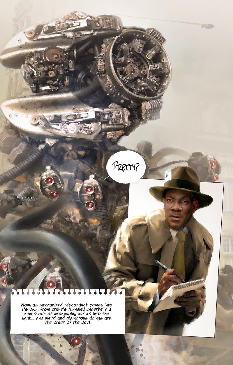 The ‘bot updated: weirder and more threatening. Also he’s more tentacle-y, because weirder, more threatening and tentacle-y is just better in your basic turnkey crime robot. And now there’s some kind of bluish-purple pulp superscience energy source in evidence because Cherenkov radiation glows like that and any and all dangerous retrofuture energy signatures must glow bluish-purple to imply danger. It’s in the illustrators’ bylaws, trust me.
