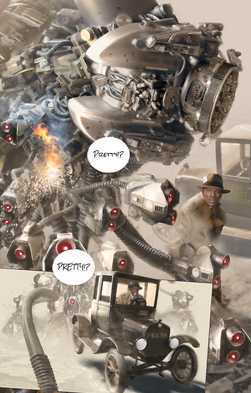 I want these refurbed final draft pulp machines, and this ‘bot most especially, to not feel like rehashed campy visions of the future from 1925, but like the actual Jazz Age tech pushed to its sci-fi limits… to impart that impression you get when you peep inside a long-disconnected fuse box left on the wall in the basement of an old apartment building, or crack open a 1920s power tool or a vintage tube radio and see the complicated muddle of brass bits and cloth-sheathed wire.